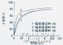 图1福来隆染料上染率曲线 由图1知,福来隆WH型活性染料三原色能保持基本一致的上染率和固色率。表明这3只染料相互拼染,其染色性能基本相同,具有较好的拼色配伍性。