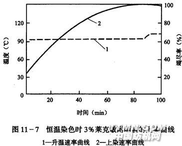 阳离子染料染色匀染方法-恒温染色法始终在85~95℃的恒温条件下进行染色45~90min,待大部分染料吸尽后再升温至100℃染色。