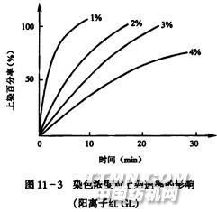 6、染色浓度低时,浓度变化引起上染速率变化很大,染料浓度略有不同,就会造成染色不匀7、染色浓度高时,浓度变化对上染速率变化影响很小,染料浓度差异,不一定会造成明显的色差8、染色越接近饱合,越容易获得匀染