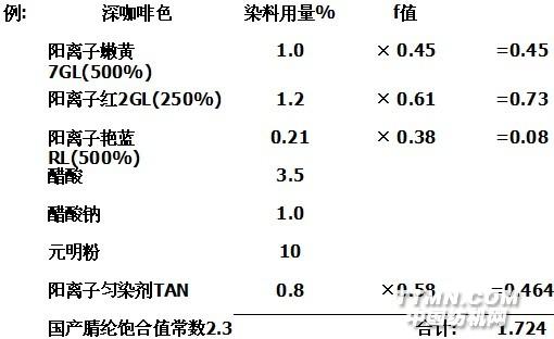 2、染料的饱和系数f(相对饱合值)纤维的饱合值除以染料的饱合值,所得的商。是指不同染料对标准染料在同一纤维上的饱合值的相对关系。饱和系数对某一阳离子染料是一个常数判断染料上染腈纶的能力f小,上染量高,浓色
