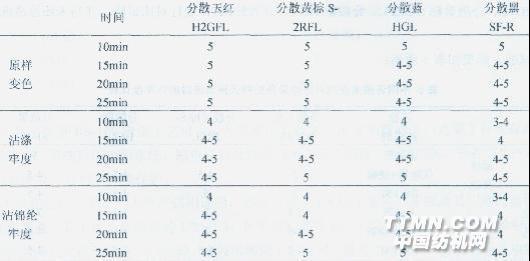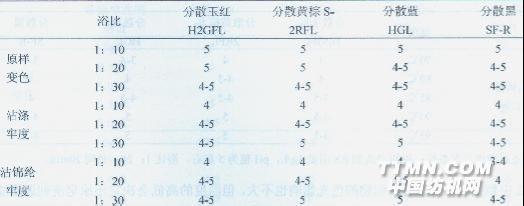 注:还原清洗工艺条件:还原皂洗剂RS用量1g/L,pH值为5左右,温度85℃,浴比1:20。 由表3中数据可知,时间对织物的色光影响也不人,但时间的K短会影响清洗效果和织物的耐洗沾色牢度,一般时间控制在15~20min左右为好。3.4浴比对还原清洗效果影响试验 涤纶纤维分散染料染色后的还原清洗,还原清洗的浴比也是主要影响因素,为此对还原清洗浴比进行了试验。 通过试验,结果如表4所示:表4还原清洗浴比对还原清洗效果影响试验