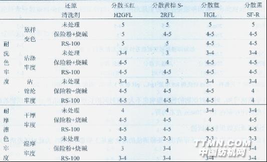 注:还原清洗条件:保险粉、烧碱2+1g/L,浴比1:20,温度80℃,时问20min; RS 1g/L,pH值为5左右,浴比1:20,温度85℃,时间20 min。 从表5中数据可知:所试验的4个染料,还原皂洗剂RS-100工艺的还原清洗能力与传统保险粉、烧碱工艺相同或有所超过。从而以还原皂洗剂RS-100替代传统保险粉、烧碱对涤纶织