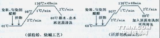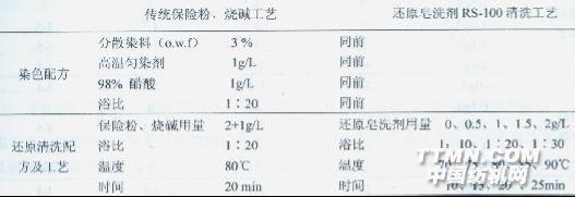 王光明 1 前言 长期以来,涤纶及其混纺织物采用分散染料染色时,染色牢度一直是个难题。在出口市场中,高水洗牢度是西欧和美国对成衣的基本要求,亚洲尤其是日本也有逐渐提升牢度要求的倾向,这就要求用特别的方法进行处理。其中,还原清洗是较为普遍和简单的方法。因为纤维表面附着的分散染料会被“还原”成无色,且较易溶于水。传统的还原清洗方法是采用保险粉、烧碱进行处理,目前,国内绝火部分厂家都还在延用这一方法。 但是这种传统方法要求在碱性条件下进行,而分散染料染色是酸性条件,因此染色后必须先排出染色液,再还原清洗而后要经热水洗和冷水洗最后还要酸化处理,整个工序繁杂,不但能耗大而且工艺时间长效率不高。另外,还原剂保险粉是一种含硫化合物,主要成份为Na2s2O4,污水排放中也冈残余人量硫化物,加重了污水处理的负担。 本研究在分散染料对涤纶织物浸染染色时,采用还原皂洗剂RS-100直接加到染色残液中进行还原淖洗。与传统的保险粉烧碱工艺相比,还原清洗效果相当,省去了放水、注水、升温等过程,缩短了后处理时间,降低了能源、水的消耗,节省了生产成本,同时减少污水排放,有利丁二环境保护。本技术研究成功,具有较大的实用意义。