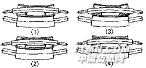 图6 气囊内支撑式轧辊线压力调整示意从图6 知,气囊内支撑式均匀轧辊是通过调节辊体内部的气囊压力来获得幅向所需的线压力。图6(1)为正向主、副气囊均加压形成线压力一致的情况,图6(2)为正向主气囊不加压形成中间线压力低于两端的情况,图6(4)为一端副气囊不加压形成一端线压力小的情况,而图6(3)则是为了更大地降低两端的线压力而采用正向主气囊、反向副气囊加压的方式。还有几种加压的组合方式可根据工作原理自行调节。边中色差的调整与液压内支撑式染色轧车的方法相似。