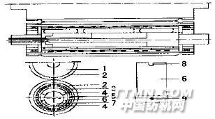 气囊内支撑式染色轧车主要也是由轧液和加压控制操纵系统组成。轧液部分除均匀轧辊结构不同外,其余与液压内支撑式染色轧车相同。气囊内支撑式染色轧车的轧液辊由一只普通结构轧液辊和一只辊体内装有气囊、具有新型结构的均匀轧辊组成。普通结构轧液辊为主动辊,均匀轧辊为被动辊。新型的气囊内支撑式均匀轧辊内部结构见图3。