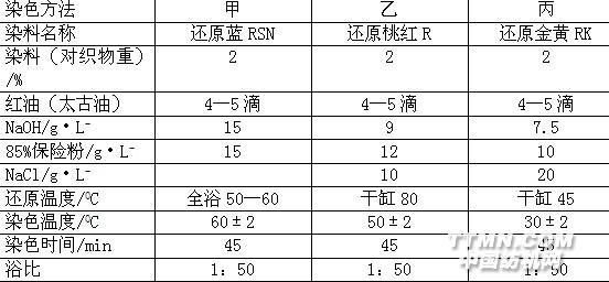 2.染液配制:干缸法:称取染料→加入烧杯中→加太古油→调匀→加少量水→调匀→加入2/3的NaoH和保险粉→加入1/3的水→在规定温度下干缸还原10—15min→加入剩下的1/3NaoH和保险及2/3的水→即配成染浴。全浴法:称取染料→加入烧杯中→加太古油→调匀→加少量水→调匀→加保险粉、NaoH→加规定的水→在规定温度下,全浴还原10—15min→即为染浴3.染色步骤: 将染液调到染色温度→投入织物→染色10—15min→加入1/2NacL→再染10-15min→加入剩于的1/2 NacL→续染10—15min→取出织物→均匀挤干→摊开放在空气中氧化15min→水洗→皂煮(肥皂2 g.L-、纯碱2 g.L-、浴比1:30,95℃,10min)→水洗→晾干→贴样。备注:还原染料染色后都要皂煮处理,皂煮目的有二,其一是为了去除聚集在纤维表面的浮色,以增加耐摩和耐洗色牢度;其二是为了获得所需的色光。在隐色体被氧化后,染料只是以其单个分子与纤维素分子相作用而零乱地排列在纤维内部,经皂煮后,染料分子间互成结晶态,而使色光稳定。