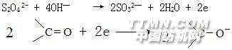 还原条件还原染料在还原剂的作用下被还原,溶液是碱性时生成隐色体;溶液是酸性时生成隐色酸。隐色酸在水中的溶解度很低,因而生成隐色酸是不利于染色的,所以还原必须在碱性条件下进行。还原染料染色时常用的还原剂是保险粉,保险粉在苛性碱(NaOH)条件下具有较强的还原能力,几乎所有还原染料都可以用保险粉进行还原。烧碱使染料还原后生成隐色体,并中和保险粉在还原过程中生成的酸性物质。在碱性条件下,保险粉按下式反应放出电子,染料接受电子被还原成隐色体:.jpg)