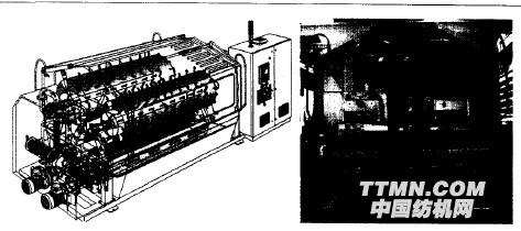 图1 Vario Line卷染机(Otto-Pricken)意大利Brazzoli公司展示了其经轴-卷染机主机型(图2)。高压罐与卷染机的组合已申请专利,它大大缩短了加工时间(40% ~50%),降低了能耗和水耗。织物在浴槽底部运行,从一个导辊至另一个导辊无需停留,并由导辊中的离心泵泵送染液,使染液完全透过织物。目前该设备只用于气流染色工艺,但传统的卷染工艺也可使用。这~ 新型液流体系是否能够达到均匀的漂白和染色效果尚待分晓。众所周知的Innoflow EXL染机,在高压染罐中新近安装了横动系统,使染液形成创新的平移流。这种流动方式实现了最优化的染液与织物的相互作用。同时这一新型体系也可用于Multiflow MUST单布环染色机中。