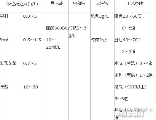 (一)可溶性还原染斜性能及染色过程 可溶性还原染料在水中的溶解度与分子结构中所含可溶性基团的多少有关,可溶性基因越多,其溶解度越大,加入电解质,会降低溶解度,增加染料的上染率。可溶性还原染料染色分两步完成,第一步是染料对纤维的吸附、上染;第二步是染料在纤维上的水解、氧化,即染料的显色过程。当织物浸入染液后,染料被吸附并扩散到纤维内部,因为染料对纤维直接性较低,故可加入食盐或元明粉促染。为防止染料遇酸性物而产生水解及氧化,可在染液中加入适量纯碱,以保证染料的稳定性。