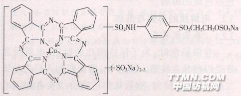 崔浩然 1 问题的提出 中温型活性翠蓝(C.I.活性蓝21)色泽艳亮,是纤维素纤维染亮绿或艳蓝必不可少的染料。然而,在浸染染色时,该染料却容易产生色泽不匀、色点色渍、牢度低下,以及提深性不佳等问题。2 问题的分析 活性翠蓝存在上述问题的根源.归纳起来有二个。2.1 活性翠蓝的分子结构特殊 活性翠蓝属铜酞菁染料,其分子结构成立体状态,体积硕大,严重缺乏线性,这就产生了先天性缺陷。其结构如下:
