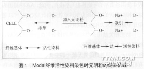 Modal是一种新型高湿模量的再生纤维素短纤维。它采用欧洲榉木浆粕经纺丝制成,具有良好的吸湿性、柔滑飘逸性和舒适性,且生产加工过程清洁无毒,其纺织品的废弃物也可自然降解,是品质与舒适的象征。根据产品风格、生产成本和市场的需要,Modal产品可在其生产的各个环节进行染色,如散纤维、纱线、织物、成衣染色等。为使成纱获得某种效果,如较丰富的色彩层次,朦胧的感觉,或为减少纱线的色差,可采用散纤维染色方式。染后不同色泽的Modal纤维按特定比例与白Modal纤维混纺,便可获得绚丽多彩、风格独特的 Modal混色纱,增加了纱线的附加值。 上述的Modal混色花纱“先染色,再纺纱”加工方式,对Modal散纤维的染色均匀性、染料和加工工艺的要求较低,且出现色偏或色花等质量问题后也可在后道纺纱生产中进行弥补,但其缺点在于市场反应速度慢,着色Modal纤维半制品的数量多。为适应市场需求并做出快速反应,将阳离子改性Modal纤维以特定比例和Modal纤维均匀混合并纺纱,制得差异化改性Modal纱线(简称改性纱)。该改性纱应用活性染料进行染色,可一次性染出花纱风格。本文重点介绍Modal散纤维的阳离子改性机理和工艺,差异化改性Modal纱线的制作方法,并对其织物的浸染工艺进行了分析和探讨。1 差异化改性Modal纱1.1阳离子改性机理 Modal散纤维通常使用活性染料染色,在碱性染浴中,活性染料呈阴离子性,而Modal纤维也呈阴离子性,两者相互排斥,需大量元明粉促染,如图1所示。染色废水中含高浓度染料和盐,严重污染环境。