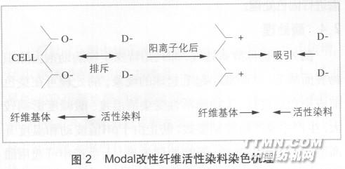 应用阳离子改性剂,如含环氧基的季胺盐类化合物,可将Modal纤维阳离子化。改性剂中含有反应性基团,可在氢氧化钠等碱剂存在下,与Modal纤维素纤维中的羟基进行反应,而它们本身又自带正电荷,所以可使Modal纤维变为含阳离子基的纤维。Modal