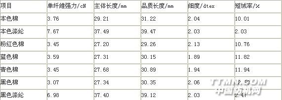 1 染色棉纤维的配色1.1 色纤维性能的比较色纤维是棉纤维经过煮练、染色工艺后获得的。在这一过程中,纤维在外界的作用下相互扭结,并产生了一定的损伤,致使各种性能较原纤维都有所改变。几种色纤维的性能比较见表 1。表1 几种色纤维性能比较