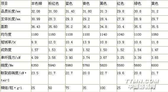 1 原料性能与选配 天竹纤维:选用河北省吉藁化纤厂生产的天竹纤维,细度l.65dtex,长度38 mm,干强4.4l cN/dex,湿强3.9cN/dtex,干伸长19.8%,含油率0.35%,质量比电阻lg Pm为8.8,超长纤维率和倍长纤维率为0。 染色棉纤维:本色棉经过染色加工后,长度变短,均匀度变差,短绒率升高,单纤强力变低,此外,还存在弹性变差,天然卷曲和抱合力变差,包间与批间色差大,且有杂色现象。为提高色纱质量,应选择较好的原棉进行染色。染色棉性能见表1。 表1 个染色棉的物理指标