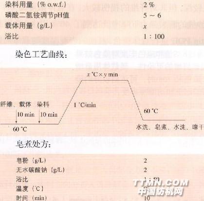 聚醚砜(PES)树脂是一种综合性能优异的热塑性聚合物材料,它具有突出的阻燃性能,极限氧指数为38,具有自熄性;玻璃化转变温度为225℃,为无定形材料,连续使用温度为180~200℃。最初是作为阻燃性、耐热性、耐化学药品性和机械性能等方面都非常优异的特种工程塑料开发出来的,国内外极少见有真正在纤维方面进行应用开发的研究。北京服装学院采用熔融纺丝法制得了聚醚砜纤维,并应用于航空航天领域的先进复合材料,取得了较好的效果。将聚醚砜纤维推广到民用纺织品,就要研究其染色性能。近年来对一些高性能纤维如芳砜纶、芳纶等大多采用载体染色法,以降低染色温度。考虑到聚醚砜的玻璃化转变温度也较高,且分子链上没有能与染料分子相结合的反应性基团,因此采用分散染料对其进行载体染色。1试验1.1材料与药品聚醚砜纱线(35 tex/24 f,自制);Foron艳红RD?BR、Foron黄RD一4GRL、Foron蓝RD?E(Clariant(科莱恩)公司);CTC一480导染剂(北京中纺化工有限公司);环保型载体Dilatin POE(clariant公司);磷酸二氢铵(A.R.);洗涤剂;无水碳酸钠(A.R.);皂粉。1.2仪器恒温水浴锅(余姚市东方电工仪器厂)、0RINTEX电子测色配色系统(意大利0RINTEX染色技术(北京)有限公司)、Y57lA摩擦色牢度机(浙江温州纺织仪器厂)、SDLM228耐洗色牢度测试仪(美国SDL ATLAS公司)、Q-SUN氙灯实验箱(Q-PANEL实验室产品公司)、Y172型纤维切片器(常州纺织仪器厂)、XPL一1偏光显微镜(新天精密光学仪器厂)、YG021PC型电子单纱强力机(温州方圆仪器有限公司)。1.3试验方法(1)前处理冷水洗一洗涤剂洗涤(洗涤剂4 g/L,60℃×10 min,浴比:l:50)一热水洗(60℃×10 min)一冷水洗