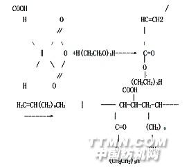 3.1 梳型聚合物超级分散剂日本Xerox报导(AKzo公司)的疏型聚合物,平均分子量为20000,以马来酸酐与具有特定长度亲水碳链的聚氧乙烯醚反应,产物再与具有疏水性碳链的α-烯烃反应,如下: