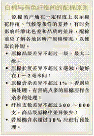彩棉配棉与白棉配棉基本相似,首先要减少批与批间比色差波动,其次应以成熟度为掌握重点,减少五种有害疵点的含量;注意减少批与批间纤维品质长度和纤维支数的差异和波动。