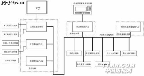 1、PC作为系统的上位机通过串口与主控制箱的PLC主站模块的通讯口0连 接,采用RS232通讯实现对PLC数据的采集和控制。 2、系统主干通讯网络采用MODBUS协议。 3、系统分为三个控制箱:主控制箱、机身控制箱、机身电磁阀接线盒。系统需要配置5个PLC主模块,以MODBUS总线协议进行通