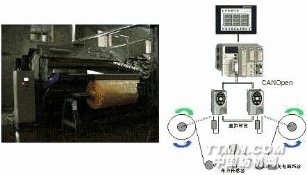 2. 控制系统方案 双变频器卷染机控制系统ATV31系列经济型磁通矢量变频器,通过Micro PLC(TSX3722)加CANOpen通讯扩展卡(TSXCPP110)作为主站,通过CANOpen总线控制2台ATV31变频器(内置CANOpen接口,作为从站)的调速和同步控制,同时配Magelis XBT-G 5.7”黑白触摸屏进行系统操作和监控。.jpg)