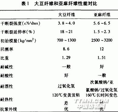亚麻纤维是一种天然纤维,具有独特的透气、抑菌性能,而大豆纤维是一种新型再生纤维,是从大豆中提取的球状蛋白质通过化学及生物化学的改性采用湿法纺丝制成,它含有羟基、氨基、羧基等人体所需的极性氨基酸,对人体具有一定的保健作用。将亚麻、大豆纤维二者结合起来,既能发挥亚麻、大豆纤维的优点,又能克服亚麻织物手感粗硬、弹性差和大豆纤维软糯的缺点,该产品集中了透气、卫生、保健等特性,是一种新型的高档产品。