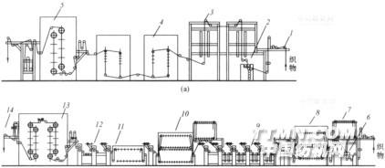 11—长蒸箱 12—平洗槽 13—烘筒烘燥机 14—落布装置