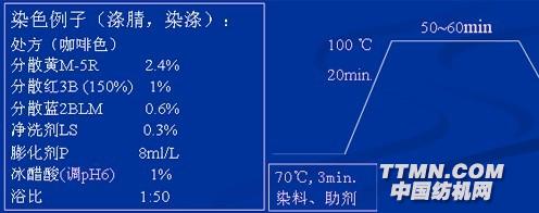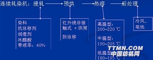 3、热溶(熔)染色法170~220 ℃无水染色。热溶处理仅1~2min.,染料瞬间入织物。热溶染色工艺: