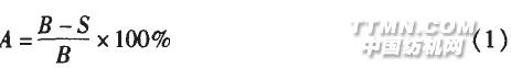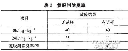 式中:A一氨吸附除臭率(%);B-无试样容器残留NH3,气体浓度(mg/kl);S一有试样容器残留NH3气体浓度(mg/kg)。