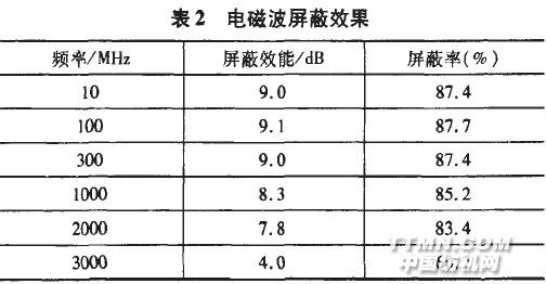 从表l可见,含银竹炭涤纶织物对氨的吸附除臭率可以达到67%,除臭效果显著。5 电磁波防护功能由于含银竹炭涤纶织物中的银离子、其他金属元素和涤纶中苯环对电磁波的吸收作用,织物具有一定的电磁波防护功能。用HP 8563E型光谱分析仪和HP 83732B型信号发生器测得织物的电磁波屏蔽效果见表2。
