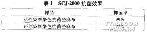 由表1可以看出,活性红X一3B和活性黄X-6G染色兰麻织物,经过SCJ一2000抗菌整理后,其刀5值比抗菌整理前小。经抗菌整理后,浅色和中色织物的色光改变不大,但是深色织物的刀5值变化很大。因此,SCJ一2000抗菌整理对x型活性染料染色的浅中色竺麻织物的色光影响较小,但对深色织物会有一定影响。