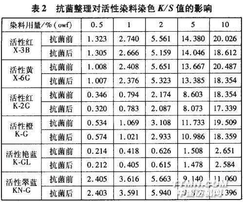 由表 1可知,染色织物抑菌率)05%,可判定该产品在规定的时间内有滞留抑菌作用。所以可以认为,活性染料和还原染料染色竺麻布经过SCJ一2000以洲)抗菌整理后,仍具有很好的抗菌效果。2.SCJ一2000抗菌整理剂对染色色光的影响2.2.1 对活性染料染色色光的影响为了比较抗菌整理对不同活性基团染料色光的影响,分别选用不同浓度的X型、K型和KN型染料染竺麻布,然后再经抗菌整理,比较抗菌整理前后的色光变化,结果(表2)。