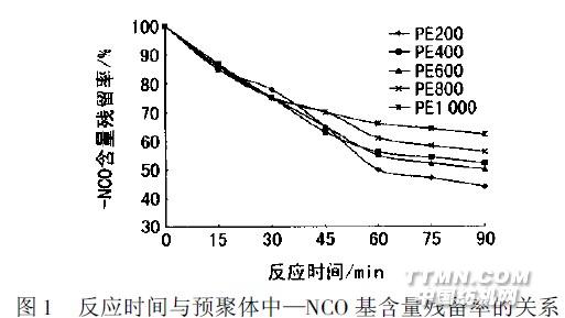 1免烫整理剂FR-ECO 100水性聚氨酯10MgCl2 / %(相对于FR-ECO 量) 10渗透剂JFC 21. 3. 2 工艺流程织物二浸二轧整理液(带液率70 % ~ 80 %)--预烘(80 ℃)---焙烘(160 ℃ × 2 ~ 3 min)---水洗--皂洗--水洗---烘干1. 4 测试方法—NCO 基含量测定 采用二丁正胺法[1]。折皱回复角测定 采用YG541B 型折皱回复仪测定织物经、纬向各六次,取平均值。断裂强度测定 采用YG(B)026D-250 型电子织物强力机,测经向五次,取平均值。撕裂强力测定 在YG033 型织物撕裂仪上进行,测定织物经向五次,取平均值。2 结果与讨论2. 1 PE 分子量对预聚反应及免烫整理效果的影响以乙酸乙酯作溶剂,分别用分子量为200、400、600、800、1 000 的聚乙二醇(PE)与TDI(TDI 中—NCO基与PE 中—OH 基的摩尔比为2 : 1),在50 ℃条件下反应,间隔15 min 测定反应物中—NCO 基含量,其—NCO基含量残留率与反应时间的关系如图1 所示。