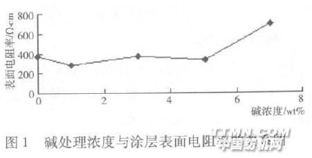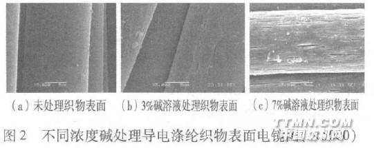 由图1可见,碱处理浓度较低时,涂层织物的表面电阻率变化不大。但是随着碱浓度的提高,达到7%时,表面电阻率增大,这是因为碱浓度增大,织物损伤严重,涂层不均,且涂层织物容易破裂。在织物的电镜图2(c)中可清晰地显示出,当碱浓度为7%时,纤维上布满腐蚀的裂痕,且深入到了纤维内部