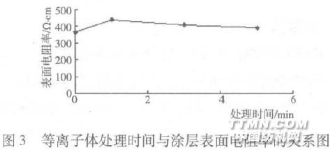 2.2等离子体处理对导电性能的影响在设定等离子体条件(Ar,100w,30Pa)下,分别对3块导电涤纶织物处理1 min、3 min、5 min后,涂覆镍涂料,制得导电涂层织物,测得各涂层的表面电阻率关系如图3所示。