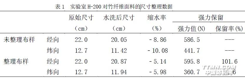 表1 很清楚的显示出经H-200 整理过的竹纤维相对未整理面料表现出良好的尺寸稳定性,并且试验现象表明整理织物水洗后的保持了良好的光泽和手感,而未经整理的面料不但尺寸有明显变化,也使面料失去了原有的丝绸般光泽和滑爽的手感。3.5 工厂大样配方A:尺寸稳定整理剂H-200(上海市纺织科学研究院纺化中心、工业纯) 12%催化剂(次亚磷酸钠、工业纯) 4%柔软剂(工厂使用为非离子型) 5%配方B:超低甲醛树脂(BASF) 12%催化剂(BASF) 4%