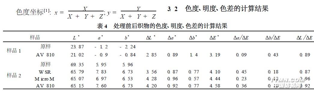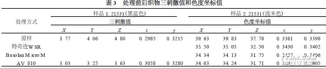 4 结果与分析实验结果表明, 经防缩处理后织物与原样有一定的色差。从表3 三刺激测试结果可见, 处理后样品的X Y Z 值均降低, 其中Y 值(明度指标) 降低最明显,实际处理后织物颜色变深。