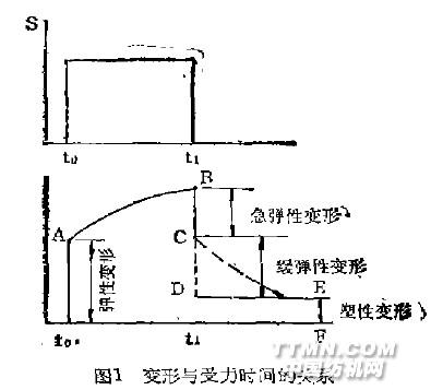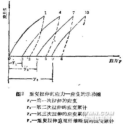 图1表明: 在to~t 时间内, 外力所日I起的应力S不变。当外力开始作用于纤维时,就出现瞬时弹性变形, 随着受外力时间的增长,变形逐渐增加。AB为外力作用下变形与作用时间的关系曲线,呈指数曲线状态。即变形在开始阶段增长的速度很快, 以岳遥渐缓慢,一旦外力去除, 则急弹性变形Bc立即消失, 接着消除缓弹性变形CD,长时间不能消失的变形为塑性变形EF。现实生活中如进行手洗衣服、体育锻炼、走路等活动时,服装
