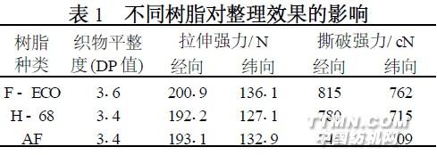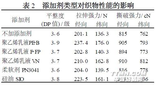 2、3 添加剂的影响采用添加剂改善织物的整理效果, 表2 例举了几种添加剂的使用效果。从表2 看出, 不同添加剂对整理后织物的性能有很大的影响。加入添加剂