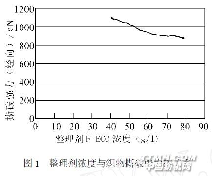 由表1 知, F - ECO 树脂整理织物的平整度最好DP 值最大, 拉伸强力和撕破强力也较好, 因此选用树脂整理剂F - ECO 做进一步试验。2、2 整理剂浓度的影响整理剂的浓度过高, 会使织物的强力下降(见图1 ) 。但是,整理剂的浓度过低,织物的抗皱性差。