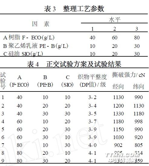 综上所述, 通过单因素分析, 采用树脂整理剂F - ECO , 添加剂聚乙烯乳液PE - B 和硅油SIO 进行试验较好。2、4 工艺优化为了优化工艺配方, 笔者对影响整理效果的主要因素采用L9 (3的3次方) 正交试验, 以获得最佳工艺配方。三个因子为整理剂浓度、聚乙烯乳液PE - B浓度和硅油SIO 浓度; 每个因子分3 个水平进行研究, 焙烘条件为150 ℃×3min , 整理效果用织物平整度(DP 值) 和织物撕破强力来评价(表3 ~表5) 。.jpg)