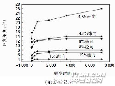 2 实验结果与分析2.1 定型剂浓度对回复角度的影响图2 为采用不同浓度的定型剂处理后预定型织物回复角的蠕变规律.