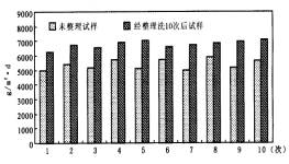 | 图7 整理前后试样吸湿量测试结果比较 | 图8整理前后试样保暖率测试结果比较 |