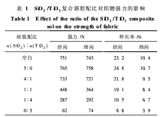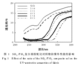 由图1可知,经复合溶胶整理过的棉织物较未整理织物在整个紫外波段的透光率都有一定程度的下降,当n(SiO2)∶n(TiO2)=4∶1~0∶5时,织物在UVB(280~315nm)和UVC(200~280nm)段的紫外线透光率显著下降,几乎接近于零。在同样的波长下,复合溶胶中TiO2的比例越大,整理织物的紫外光透过率越小,当TiO2为100%时,紫外线透过率最小,这说明在相同浓度下,经SiO2/TiO2复合溶胶整理后的织物的防紫外性能不及TiO2溶胶,这主要是因为通过溶胶凝胶法制得的TiO2是纳米级的,此时TiO2的电子结构中存在约为3.2eV的禁止带间隙