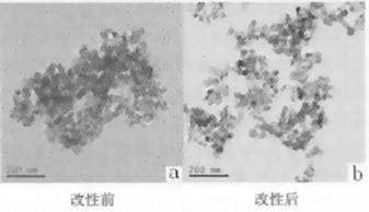 | 图3 改性前后纳米TiO2水性分散浆中 纳米粒子的TEM图 |