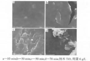 从图6可以看出,开始10~50min,随着浸渍时间的延长,织物上的TiO2明显增加。因为改性纳米粒子表面有大量的-0H,还通过化学键吸附了ΚH-560等有机物,浸渍时间越长,纳米粒子能通过氢键、化学键等作用力与丝素多肽链上一些基团结合得更加完全。50min时, TiO2基本上能很均匀地分布在织物上,即织物表面对纳米粒子的吸附达到饱和。70min时,织物表面的粒子分布变得不再均匀,有些地方可见一些细小的纳米粒子,有些地方存在一些颗粒较大的粒子,原因是当浸渍时间超过平衡吸附的时间时,