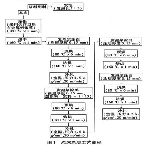 采用单层涂层,涂层薄则遮光效果差;涂层厚则易出现裂纹,因而试验采用多层刮涂方式。在织物最底层涂布银粉,以反射太阳光辐射热及紫外线,达到防紫外线和隔热的效果;再在银粉涂层上涂刮发泡遮光涂层、浅色面层,以达到既遮光又美观的效果。