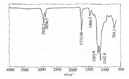 由图1可见,FSLDH分别在2920.2(νC-H,-CH3)、2856.5(νC-H,-CH2-)、1460.1(δC-H,-CH3,-CH2-) cm-13处出现了由甲基、亚甲基C-H键所产生的特征吸收峰。1732.08(s, νC=O,-COOR)、1203.6(νasC-O,-COOR)cm-1归属于酯基C=0键以及C-O键的中、强吸收峰,说明分子中有大量此类基团存在。而1141.9(s, νC-F)cm-1处的强峰以及704.1(w,δC-F)cm-1弱峰,则归属于FSLDH分子-CF2-、-CF3中的C-F键。由于FSLDH分子中所含来自于DM和HPA的链节很少,因而图1中未明显观察到由羟基O-H键及叔胺基C-N键所产生的特征吸收。