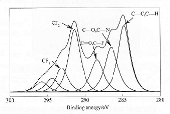 由图5、6可见(空白棉布的高分辨C1s XPS谱略,请参见文献[7-8]),在FSLDH处理后的棉纤维布样表面,存在有F、0、N、C, 4种元素,其相对质量分数(atomic conc.)分别为48.38%、6.45%和0.4%、44.53%。其中,发生在结合能(BE)284.8 eⅤ处的特征C1s峰显然归属于FSLDH分子-CH2-、-CH3基团中的C-H键以及样品表面的碳烃污染,286.45 eⅤ处为纤维表层聚合物分子中C-0键和少量的C-N键产生,288.45eⅤ 处的XPS峰为纤维表层聚合物分子中的C-O键所产生,而291.45和293.20 eⅤ 处的特征C1s峰则归属于CF2、CF3。