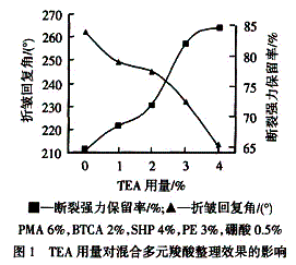 由图1 得知:随着三乙醇胺用量的增加,强力保留率增加,但折皱回复角却下降,故三乙醇胺用量不能太多,可控制在2%左右.