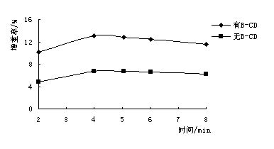 由图4看出,在4min以内,随着焙烘时间的延长, CA与纤维素和β-CD反应充分,织物增重率增加。当CA与纤维素和β-CD反应达到平衡时(大于4min),织物增重率也趋于恒定。