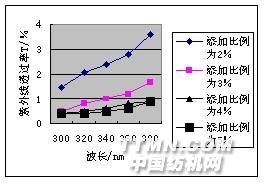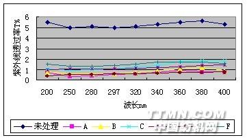 图3 不同纳米粉添加比例紫外线透过率曲线图 由图2、图3分别可以看出,在树脂膜中加入纳米粉后,膜的紫外线透过率明显降低小于5%,说明纳米粉体能够减弱紫外线的透过性,具有抗紫外线性能。并且随着纳米粉体加入比例的增大,膜的抗紫外线能力也逐渐增强,当加入量达到一定(此纳米粉为4%)之后,其紫外线的透过率基本上不发生变化,曲线也接近平滑。为了减少因子数目,节约成本,现对纳米粉添加比例进行选优。紫外线透过率越小,抗紫外线能力越好,因此选用纳米